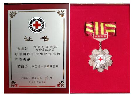 2022年6月20日,河南利欣制藥股份有限公司被中國(guó)紅十字會(huì)總會(huì)授予的2021年度“中國(guó)紅十字奉獻(xiàn)獎(jiǎng)?wù)隆保碚梦夜驹诤幽洗蟊┯昕购榫葹?zāi)中作出的突出貢獻(xiàn)。